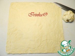 • Аккуратно раскатываем в большой прямоугольник толщиной 1,5 см, обрезаем неровные края.