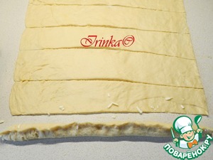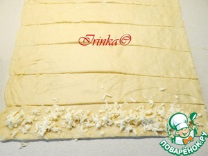 • Прямоугольник разрезаем на шесть одинаковых полос. Брынзу натираем на крупной терке. Выкладываем брынзу на каждую полоску теста.