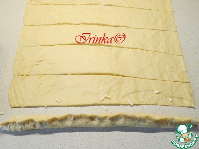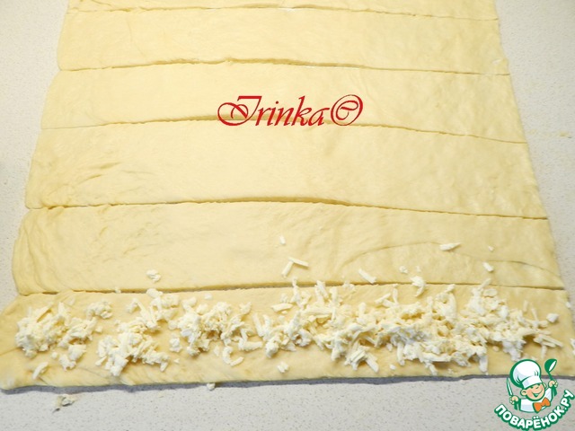 Прямоугольник разрезаем на шесть одинаковых полос. Брынзу натираем на крупной терке. Выкладываем брынзу на каждую полоску теста.