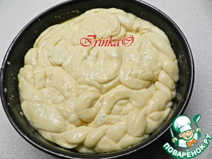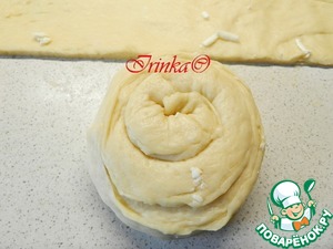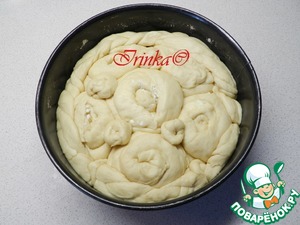 • Форму для выпечки диаметром 26 см смазываем маслом, кладем в нее полученные рулетики-пять штук по периметру, шестую-в середину.