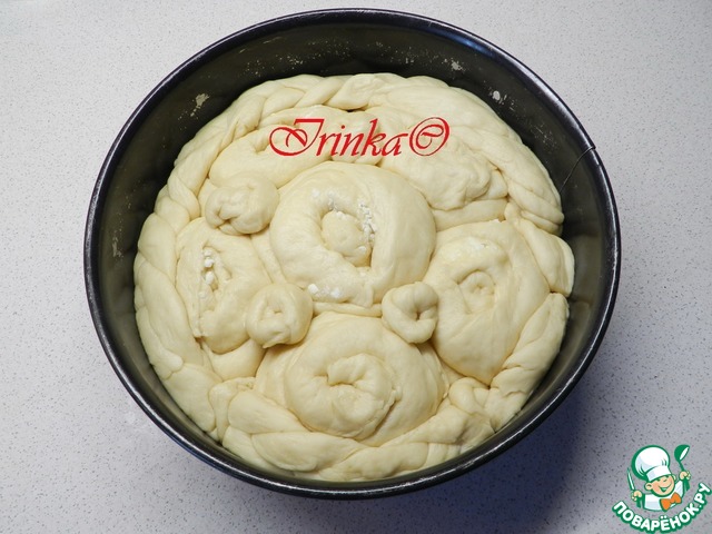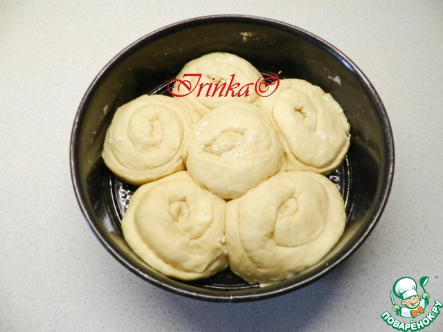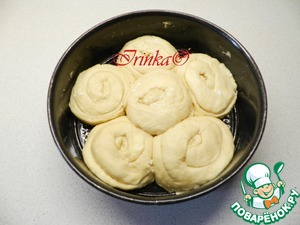 Форму для выпечки диаметром 26 см смазываем маслом, кладем в нее полученные рулетики-пять штук по периметру, шестую-в середину.
