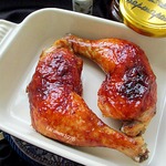 Затем увеличить температуру до 220°С и, продолжая запекать, каждые 5 минут смазывать курицу глазурью, пока она не приобретёт карамельный оттенок.