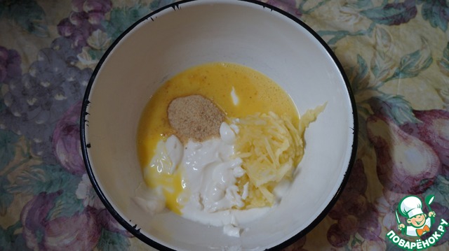 Смешать детский творожок, натёртое на крупной терке яблоко, сахар, сухари. Положить половину яйца (белок лучше взбить). Всё хорошо перемешать.