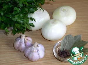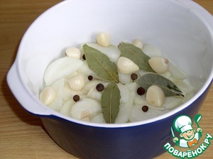 В горшочек для запекания кладем нарезанный лук, зубочки чеснока, лавровый лист и душистый перец. -
