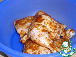 В мисочке смешаем ингредиенты для маринада и замаринуем куриные ножки. Оставим на 15-20 минут. -