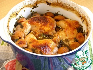Это блюдо украинской кухни традиционно томится в печи длительное время от 4 до 5 часов. В современной кухне, на газу я готовлю 2-3 часа. Первое условие - блюдо не должно подгореть. Второе, секрет блюда - должна выкипеть вся вода. И третье - за это время пряные травы и специи насыщают куриное мясо небывалым вкусом и ароматом. И потом выбрасываются. К столу подается ароматная курочка, по моему предпочтению сервированная абрикосами. Это на Ваш выбор.