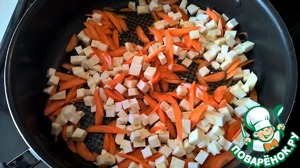 Корень сельдерея нарезаем кубиком 1 - 1.5 см