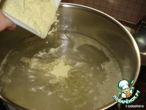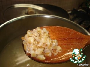Поджаренную пшеницу высыпаем в бульон, даем закипеть на большом огне, уменьшаем огонь до минимума, и оставляем вариться на 1,15 – 1,30, пока пшеница разварится.