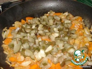 Солим, перчим, и добавляем измельченные огурцы, еще прожариваем минуты 3-4.