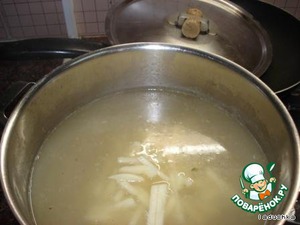 Потом бросаем картофель, порезанный маленькими брусочками, и оставляем вариться на маленьком огне.