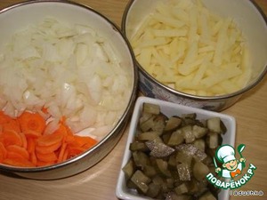 Режем небольшими кубиками лук, кольцами морковку, и мелкими кубиками огурцы, ну а вообще, можете нарезать все, по желанию.