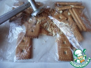 Берем печенье. Я покупала самое дешевое-молочное, оно лучше все подходит. Кладем часть печенья в пакет и отбиваем его молотком. потом вторую партию. Все сразу лучше не отбивать за один раз. Сложнее будет равномерно измельчить.