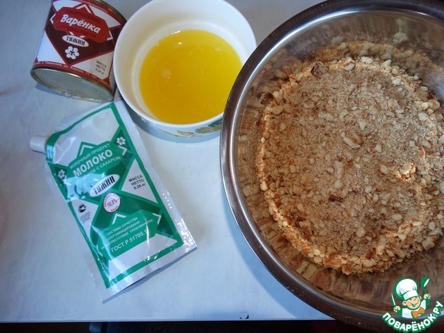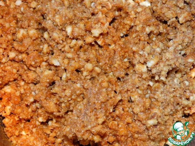 У нас должна получиться такая крошка. Не совсем мелко. Смешиваем в тарелке растопленное масло, и сгущенка (вареную и обычную).