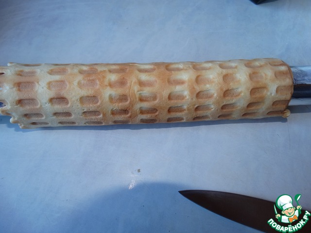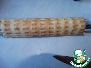 Когда вафля испеклась-начинаю ее закручивать. Накручиваю я ее на обычную бобину от фольги, там остался один слой, и я ее приспособила под каркас для вафель.