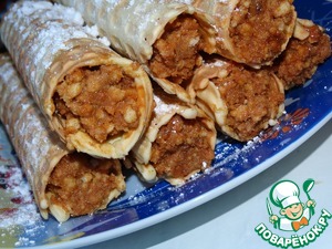 Мы закончили печь вафли, наша начинка остыла. Берем такими кусочками и просто начинаем накидывать начинку в вафлю. Прикрывая один конец рукой. Когда вафля заполнена - с двух сторон поджимаем пальчиками начинку.