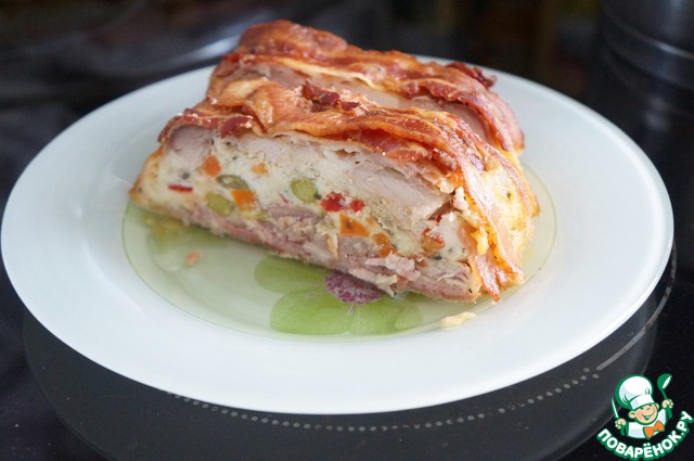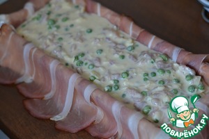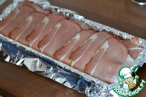 Выкладываем внахлест ломтики бекона так, чтобы концы свисали через край. -