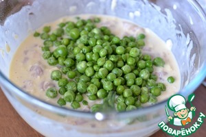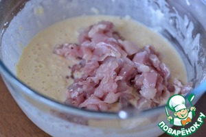 Куриную грудку мелко нарезать на кусочки. Добавить к сметанной смеси. Перемешать.
