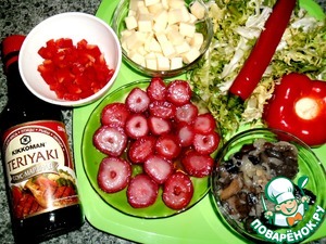 Итак! Подготовим необходимые продукты. Обжарить лук в одной столовой ложке раст. масла до прозрачности, добавить грибы и обжарить до готовности (если грибы сухие - заранее замочите, затем отварите до готовности, откиньте на дуршлаг, обжарьте с луком) охладите. Сыр и сладкий перец нарезаем кубиками, жгучий перец - соломкой, клубнику - пластинами, салат порвать или нарезать средними кусочками. -
