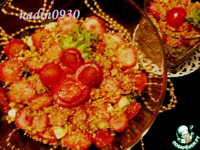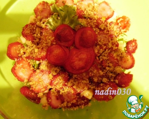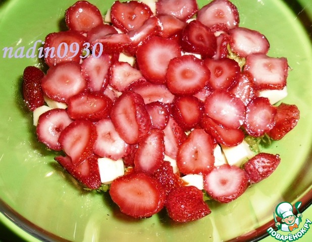 Это уже на следующий день. Поверьте, салат стал ещё вкуснее! Клубника отдала свой вкус, но аромат её стал ещё сильнее. Сыр впитал в себя все вкусы, объединил их. Моцарелла такой сыр, к любому вкусу - к месту! Всё так объединилось-соедини лось! Очень вкусно! Я впервые ела салат с таким сочетанием, мне понравилось! Продукты не испортила. От души готовила!!!