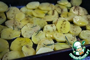 Картошку очистить, порезать пластинками толщиной примерно 5 мм. Дно противня смазать растительным маслом, выложить в него картошку, посолить, посыпать черным перцем, листиками розмарина.