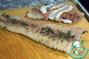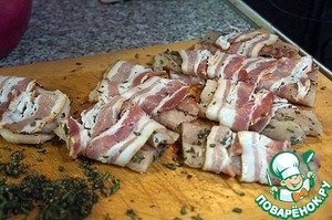 Бекон разобрать на полоски. На разделочную доску рассыпать мелко порубленные листочки розмарина, полить их оливковым маслом, перемешать, добавить соль и белый перец.