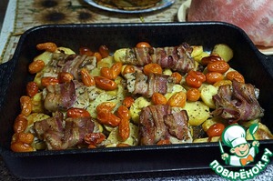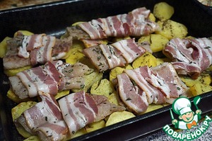 В основе блюда из трески, обернутой ломтиками бекона и запеченной с овощами, один из рецептов Джейми Оливера. Отступления незначительны. Вместо трески можно взять другую рыбу – например, северную речную: муксуна, сига, чира. Или морскую: пикшу, морского окуня. Главное – здесь лучше всего подойдет рыба с достаточно плотной текстурой.