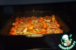 Между ними уложить целиком помидоры черри – можно их предварительно чуть посолить, но я этого делать не стал.