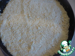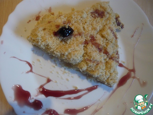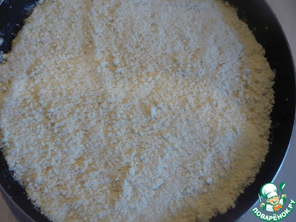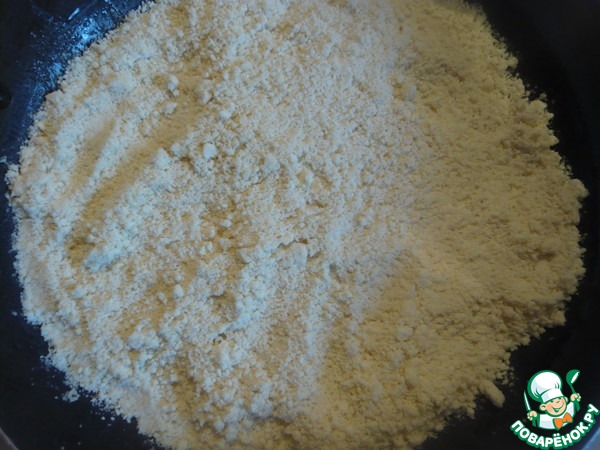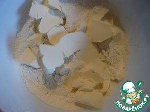 Делаем тесто: Муку просеиваем и смешиваем с разрыхлителем. Добавляем маргарин и перетираем тесто в крошку.
