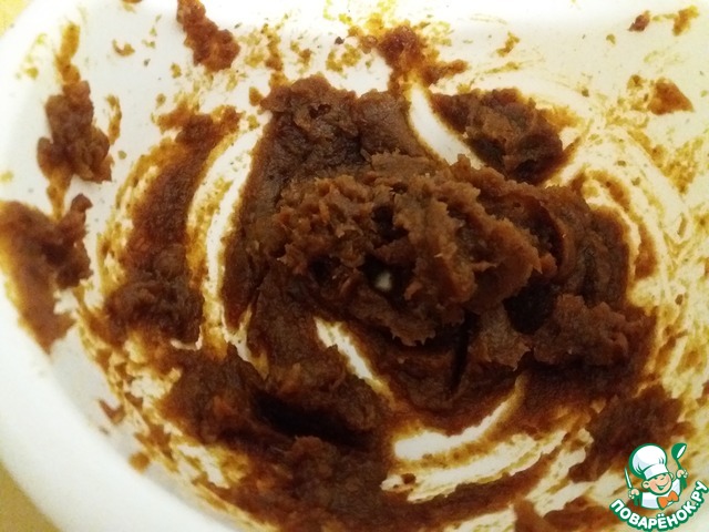 Чернослив (финики), я взяла 150 грамм, залить на час кипятком, затем выдавить косточки и мелко порезать (меня выручил погружной блендер, прекрасно спюрировал финики) -