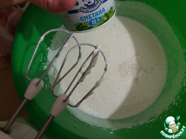 Влить 1 стакан сметаны (у меня маленькая баночка сметаны "Простоквашино" 15% жирности, 180 грамм);