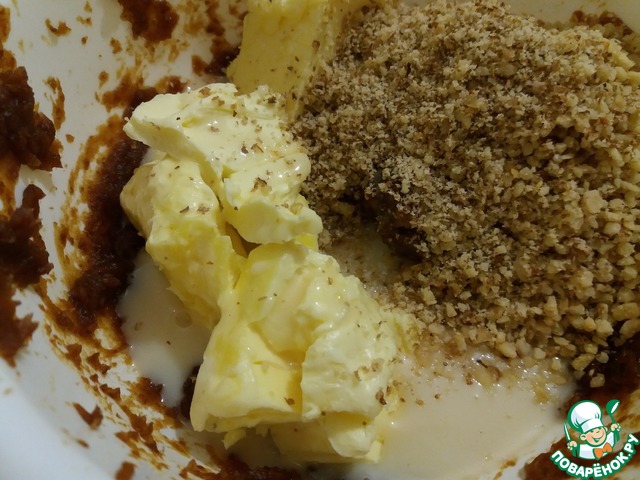 Крем: 100 грамм сливочного масла + 1/3 банки сгущённого молока + чернослив + грецкие орехи = всё смешать.