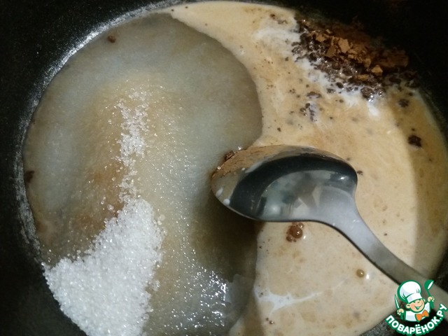 Глазурь: 3 столовых ложки молока + 1 столовая ложка какао + 0,5 стакана сахара = поставить на медленный огонь и помешивать = до полного растворения сахара, 1-2 минуты помешивать, затем снять с огня