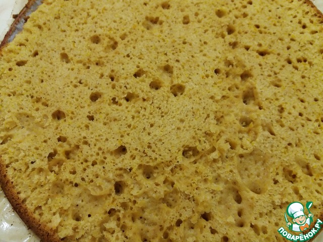 Готовый корж получился не высокий, так как форма большая (для данной формы нужно двойную порцию теста, тогда будет пышнее)