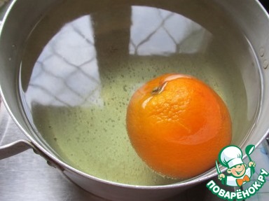 Прежде всего, нужно подготовить апельсин. Моем апельсин в горячей воде, укладываем в большую кастрюлю, заливаем холодной водой, ставим на огонь и варим 20 минут при слабом кипении.