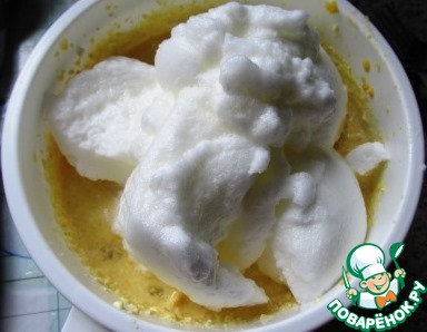 Белки взбиваем в крутую пену и в три приема вмешиваем в творожную массу