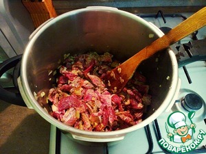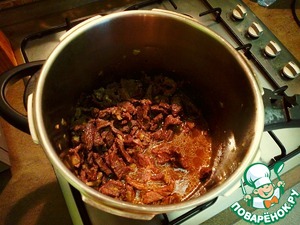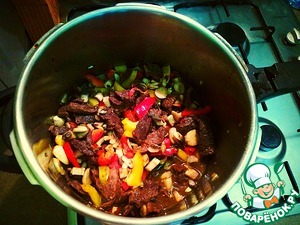 Добавляем говядину, посолили, поперчили, добавили карри. Обжариваем до тех пор, пока мясо не получит коричневый цвет со всех сторон. Затем заливаем мясо 250 мл воды. Потом пароварку/скороварку закрываем и тушим 30 мин.