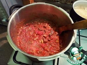Теперь ставим на маленький огонь, добавляем томатную пасту, соевый соус и помидоры (если вы используете свежие, то в миске их залейте кипятком, снимите кожуру и нарежьте).