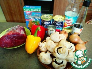 Добавляем к мясу болгарский перец и шампиньоны, опять посолили и поперчили, подлили 250 мл воды. Тушим следующих 15 минут.