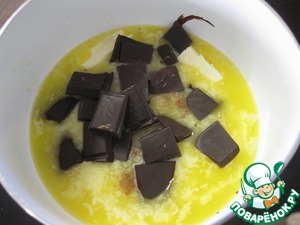 В сотейнике растаять масло для пирога, поломать в горячее масло шоколад, снять с плиты и перемешать до однородного состояния