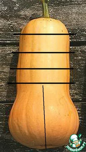 Отрезаем от тыквы с длинного конца 3 кольца толщиной 4-5 см. Чем хороша мускатная тыква - у нее в длинной части нет семечек, одна мякоть.