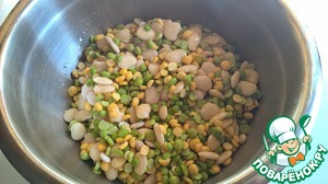 Замачиваем оба типа гороха и белую фасоль наночь в одной миске. Замачиванием мы не только ускоряем процесс последующей варки, но и вымываем из бобовых вещества, которые стимулируют вздутие. Поэтому можно поменять воду - один, два раза