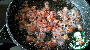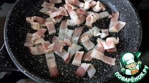 Нарезаем бекон поперек ломтиками, шириной около 1 см. Наливаем на сковородку немного оливкового масла для жарки и выладываем туда бекон. Вытапливаем жир на среднем огне.