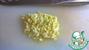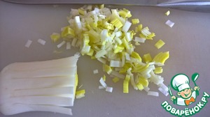 Лук порей разрезаем вдоль пополам. Делаем несколько продольных надрезов радиально (направленных к центру), оставляя около 5 мм с одного конца ненадрезанными. Затем режем поперек на маленькие кусочки - 3 - 5 мм
