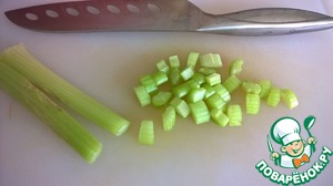 Стебли сельдерея разрезаем вдоль пополам и затем поперек - получаются кусочки около 1 см
