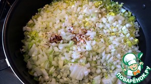 Начинаем пассеровать репчатый лук, лук порей и жгучий перец в оливковом масле на среднем огне.