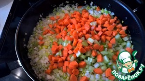 Через пару минут, когда появится характерный запах жарящегося лука, добавляем в сковороду морковь и сельдерей. Добавляем вытопленный из бекона жир. Пассеруем еще минут 10