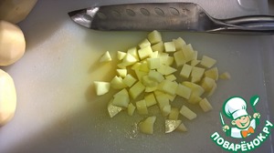 Нарезаем картофель кубиком 1 - 1.5 см. Когда горох и фасоль дойдут до полу готовности, добавляем в кастрюлю картофель.