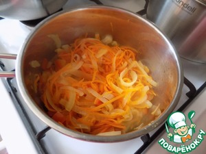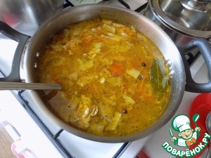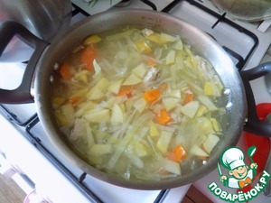 Выложила содержимое сотейника в кастрюлю к готовым овощам в бульон. Мясо сваренное разобрала от косточек на кусочки и тоже отправила в кастрюлю. Поварила ещё минут 5.
