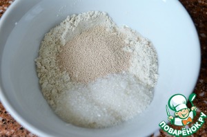В пиале соединить сахар, дрожжи и 2 ст. л. мучной смеси.