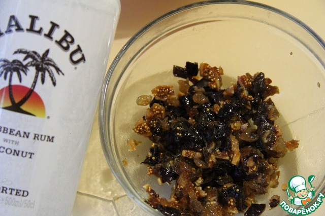 Сухофрукты и изюм (если крупный) мелко нарезать, залить ликером, пока будете заниматься тестом. -